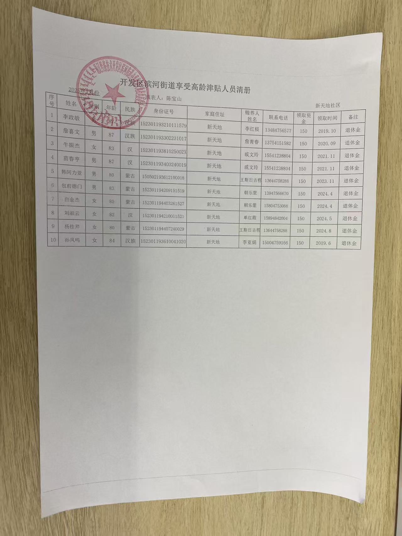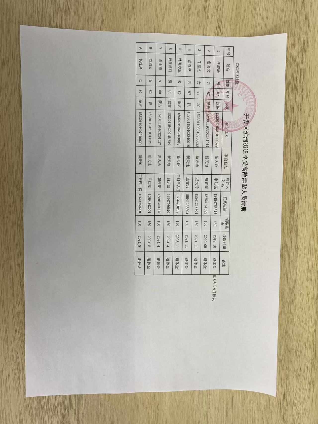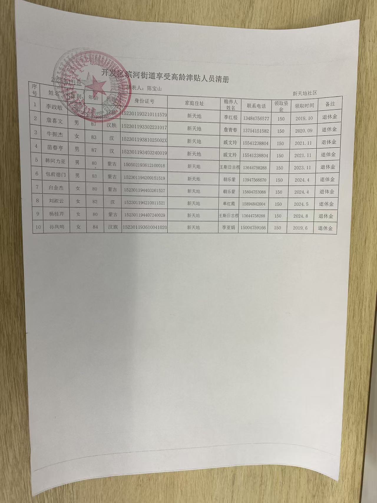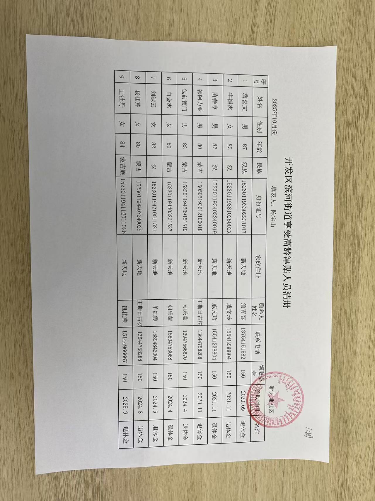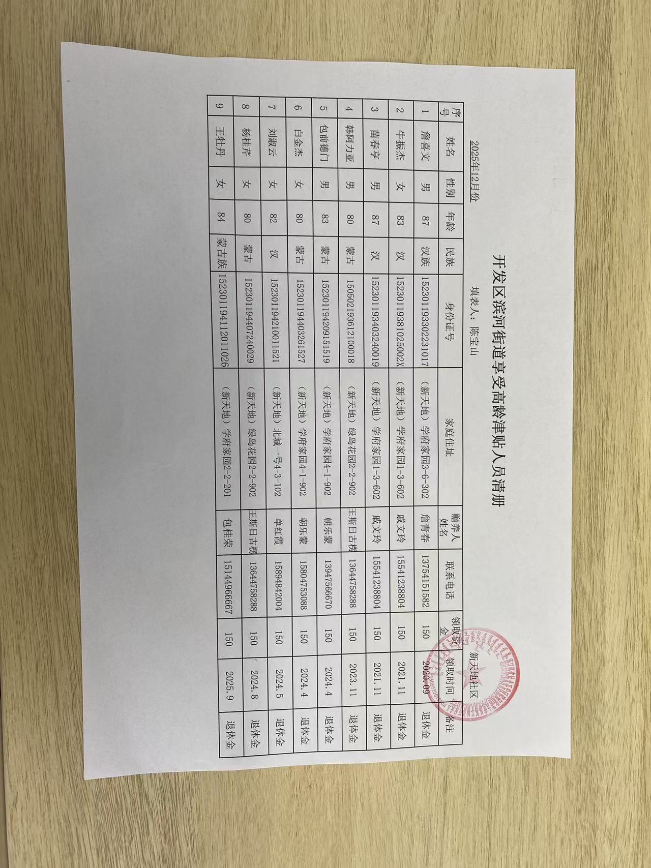 新天地社区高龄津贴在享人员花名册
