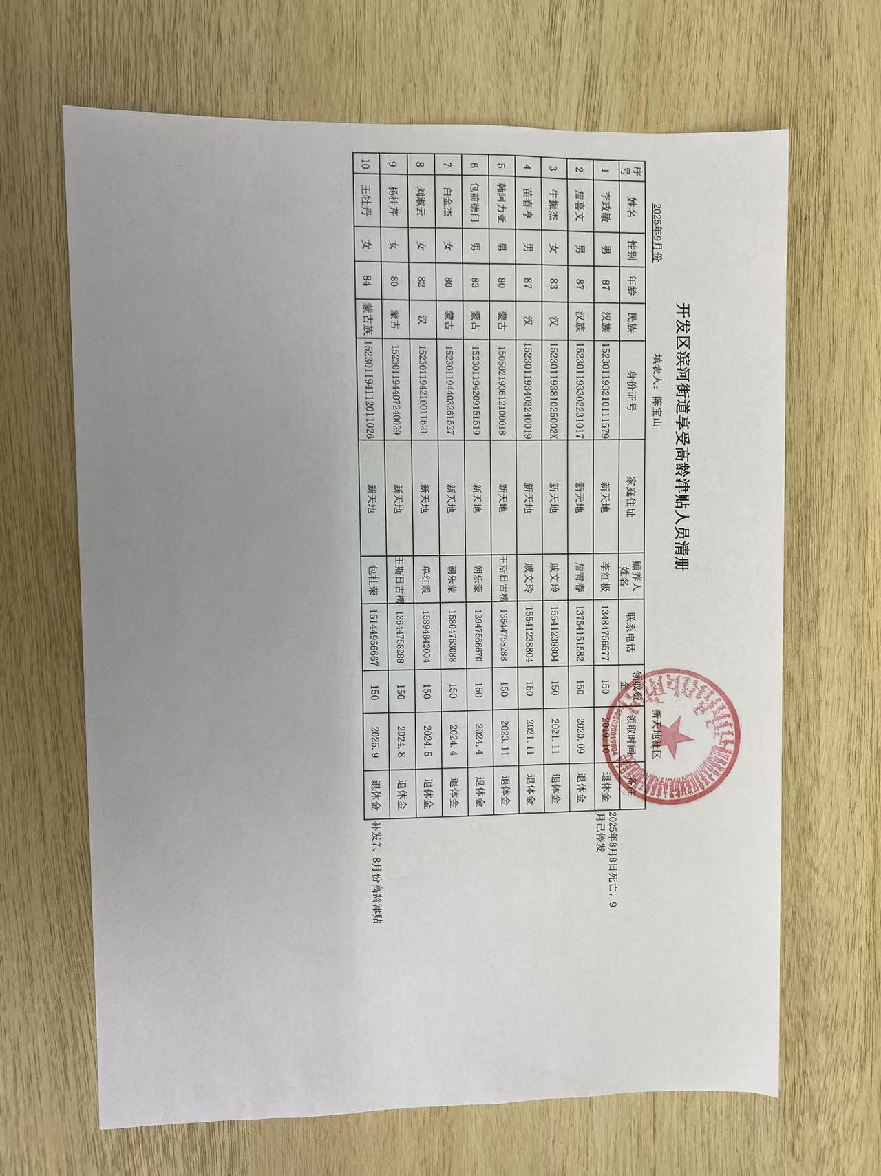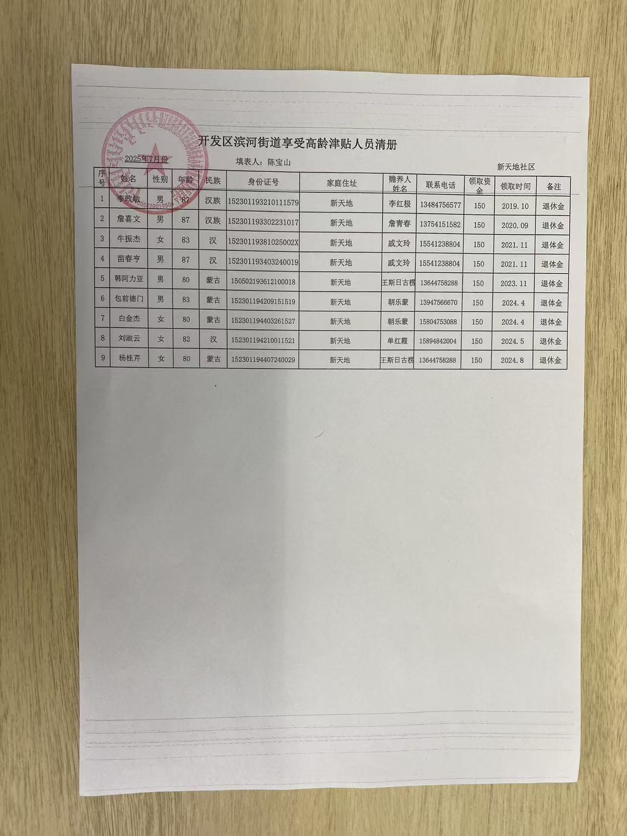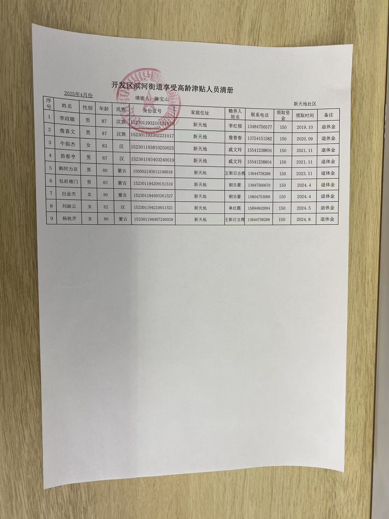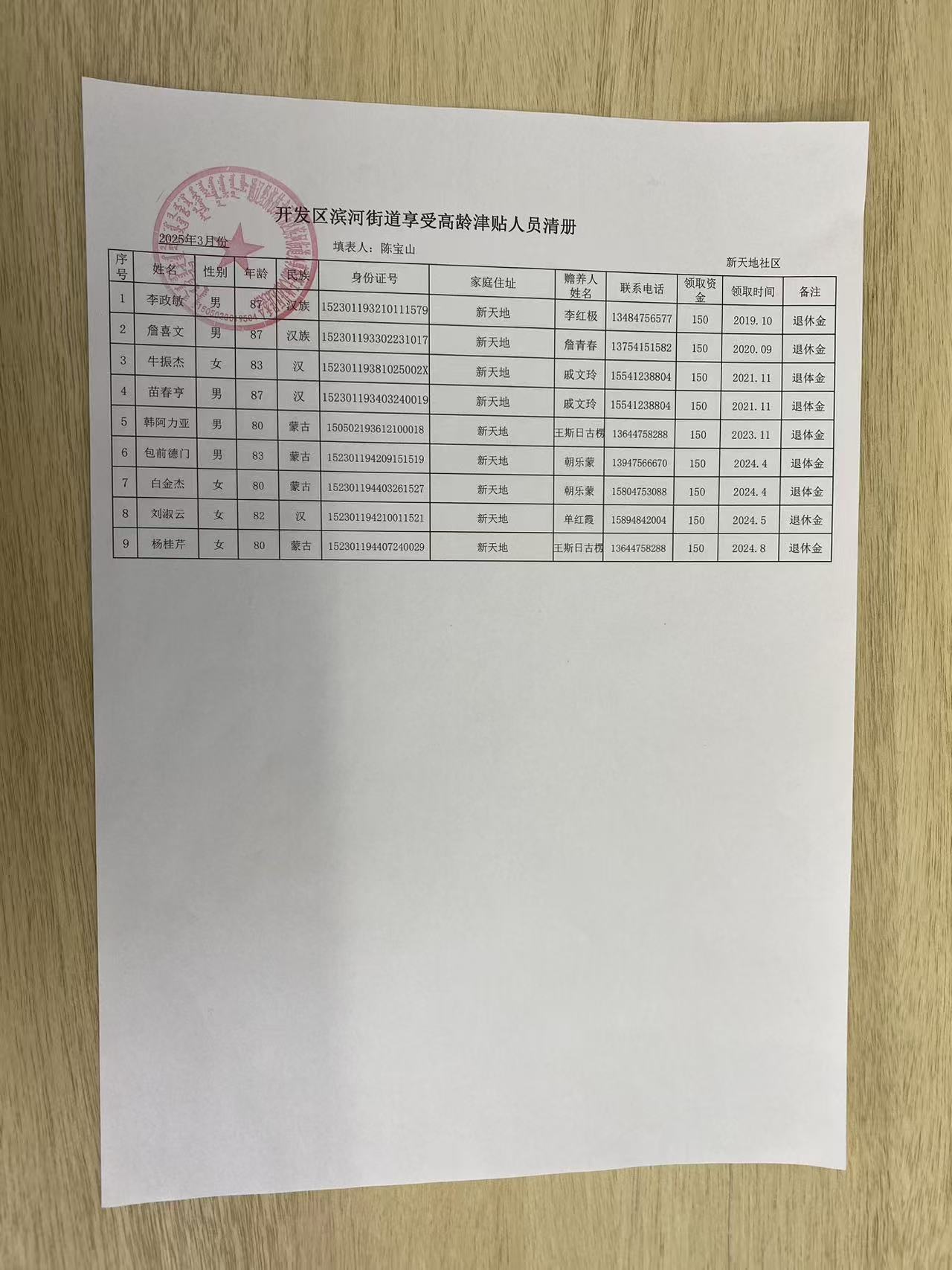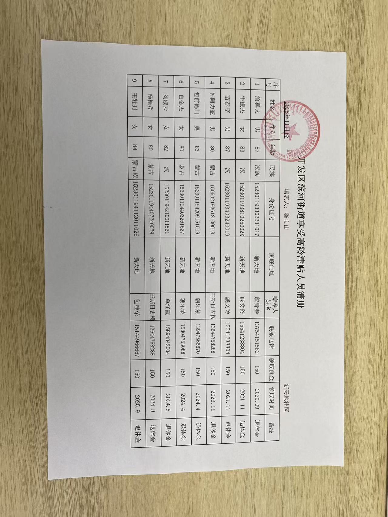 新天地社区高龄津贴在享人员花名册